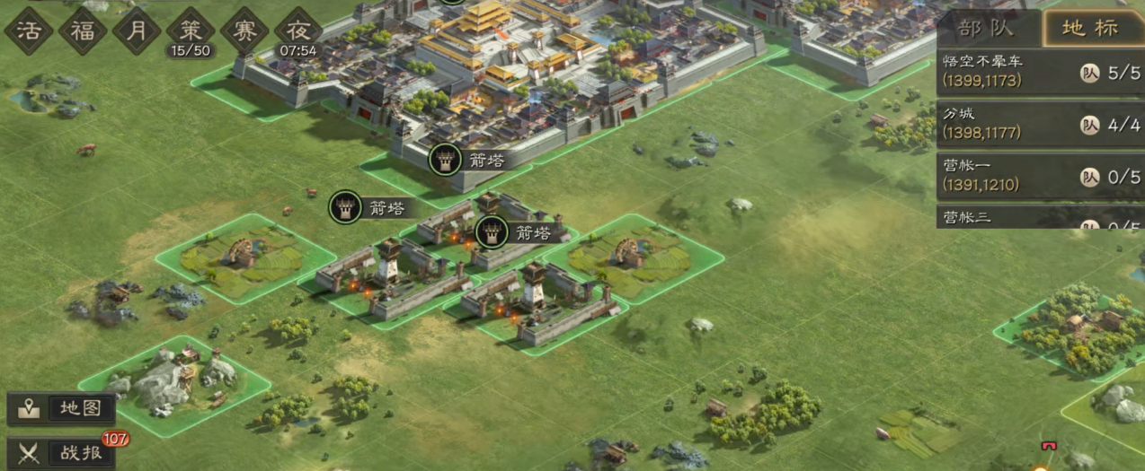 箭塔的摆放需注重战略位置选择,优先覆盖资源地、交通要道及城池周边关键区域。箭塔攻击范围有限,建议与拒马形成品字形布局,使敌军无论从哪个方向进攻都会同时遭受三座箭塔的火力压制。拒马应放置在地形狭窄处,如关卡前后、渡口或山谷,利用天然障碍限制敌军行动。外围拒马可搭配内部箭塔形成纵深防御,迫使敌军在拆除过程中持续承受伤害。