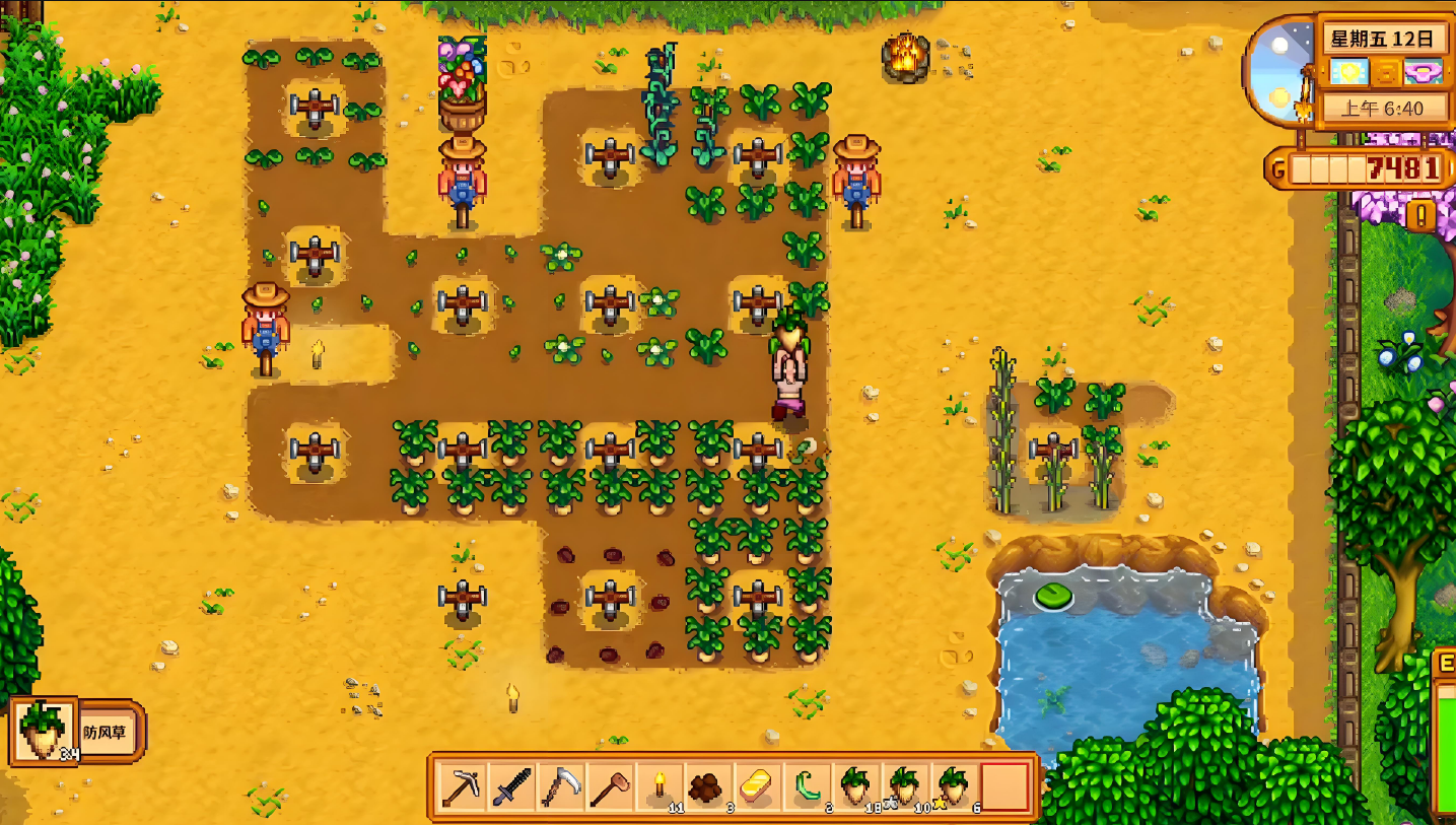 第一天记得砍50个木头做个储物箱放在家门口,这样就不用担心背包空间不够了。把初始资金都买成防风草种子种下去,这可是前期最实用的作物,既能卖钱又能当食物补充体力。记得每天浇水,剩下的体力可以用来砍树或者挖石头,但千万别把体力用光,留个3点左右比较安全。