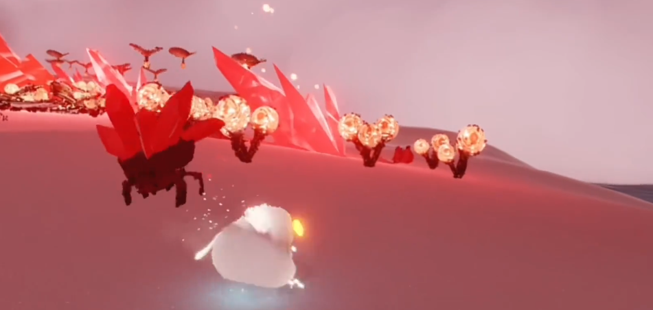 黑暗腐蚀的触发位置需通过遇境地图门上的碎石标志判断,门上出现碎石即表示该地图当前存在黑暗腐蚀。进入对应地图后,系统会提示黑暗已降临,并在地面显示红光砸落点。红石任务通常需要2-3人协作,一人稳定烛光,另一人负责点燃黑暗植物。烧毁部分植物后会出现白光传送点,进入后需躲避红石和冥龙,收集5-6轮水母星光碎片方可完成任务。