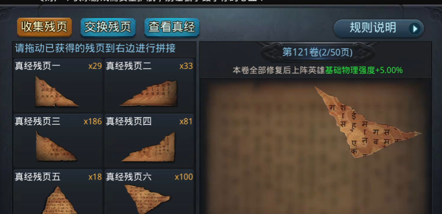 三藏真经残页是提升英雄属性的重要道具,玩家达到65级后即可解锁该系统。真经残页的主要获取途径包括排行榜兑换(消耗4个龙纹和10000积分兑换1张)、帮派兑换(修复25卷后开放)以及部分活动奖励。每卷真经需要6个残页拼合,修复后可永久提升英雄的基础法强、物强、生命值等属性,具体加成效果随机但覆盖范围广泛。需不同卷的真经需要特定编号的残页,因此收集时需留意残页的匹配性。