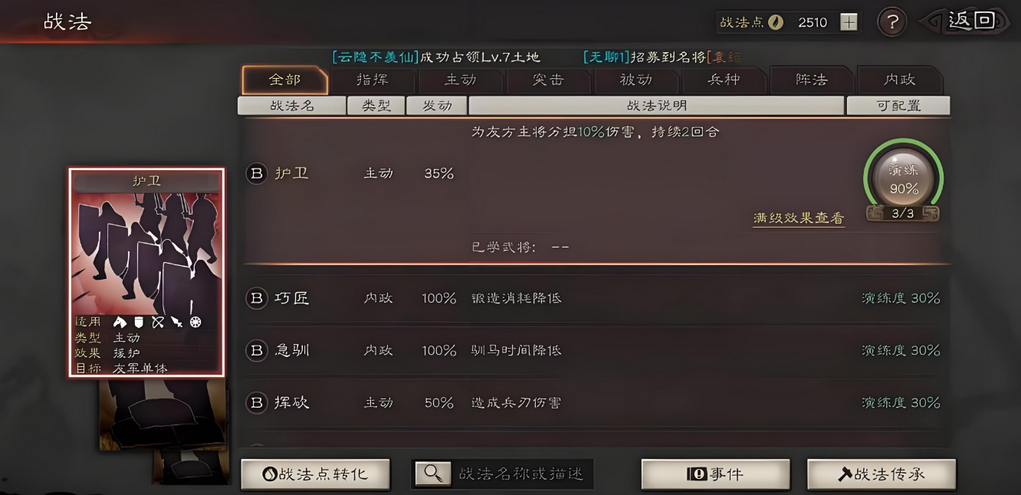战法系统是武将战力的核心组成部分,每个武将自带1个基础战法,5级解锁第二战法位,20级且自带战法满级后可觉醒解锁第三战法位。战法类型包括指挥、主动、突击、被动等,需根据武将定位选择适配战法,输出型武将适合高伤害主动战法,辅助型则选择治疗或增益类战法。战法等级通过消耗战法点提升,等级越高效果越强,需注意战法间的冲突与互补关系,避免效果抵消。进阶战法需消耗同名武将进行传承,传承后的战法需演练至100%才能使用。