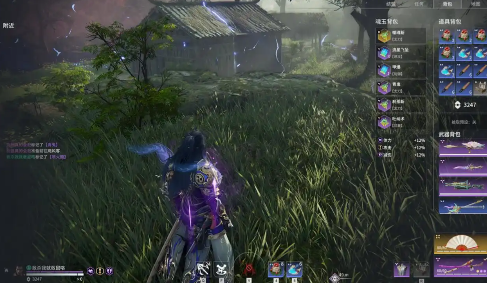 太刀作为游戏中最灵活的近战武器之一,攻速快、爆发高,但攻击范围较小,需要搭配合理的魂玉和操作技巧才能发挥最大威力。噬魂斩和夺魂·太刀是核心魂玉选择,前者能改变二段蓄力招式并提升伤害,后者在振刀终结命中后提供高额回复效果,大幅提升续航能力。惊雷一闪则是追击连招的关键,配合平击或纵击可快速贴近敌人。