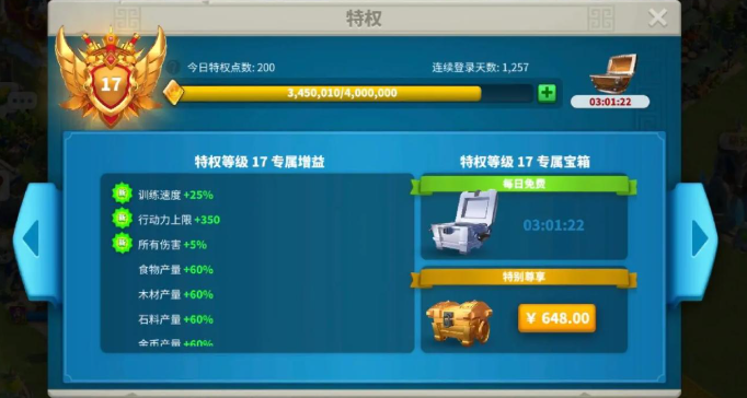 建造与研究类增益的触发通常依赖VIP特权、符文或联盟科技。VIP等级达到6级可永久解锁第二个建造队列,并减少建造与研究时间。符文提供的7%加速效果虽短暂,但在升级关键建筑或科技时能节省大量时间。联盟科技的联盟帮助功能可通过成员互助进一步缩短耗时。这类增益的使用需与个人发展节奏匹配,避免在低优先级项目上浪费加速效果。