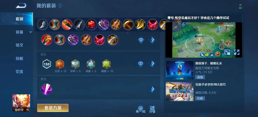 猴子孙悟空的铭文搭配主要围绕暴击属性展开,以最大化他的爆发伤害。常见的组合是十个无双、十个鹰眼,蓝色部分选择五个夺萃和五个狩猎。无双铭文提供高额的暴击效果加成,有效弥补了猴子被动技能中暴击伤害被削减的缺陷,让他的敲击更加致命。鹰眼则负责提供物理穿透,确保猴子在前期就能对敌方坦克造成可观的伤害,避免出现刮痧的情况。夺萃铭文带来的物理吸血增强了前期的续航能力,减少回城次数,狩猎则提升了攻击速度和移动速度,让技能与普攻的衔接更加顺畅,跑图和支援也更加灵活。这套铭文整体上平衡了输出、生存和机动性,非常适合依赖技能后强化普攻打伤害的猴子。