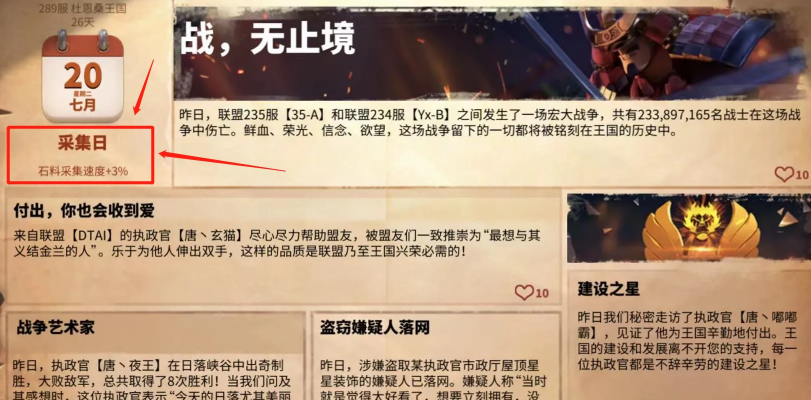 那这份报纸具体都记了些啥呢?内容还挺丰富的。它会报道新晋强国,也就是那些发展特别快、战力飙升猛的王国,这既是荣誉也容易成为众矢之的。还有联盟大战,如果当天有大规模战斗,报纸会以丧钟为谁而鸣这样的标题记录阵亡的军队总数,让你对战争规模一目了然。个人玩家也有机会上榜,比如一天内击败野蛮人最多、采集资源最多、探索地图迷雾最多的玩家,都可能被当作卓越的指挥官登上专栏。就连游戏里的一些常驻活动,比如最强执政官的排行榜情况,有时也会被写进活动轶事里。甚至还有一些轻松诙谐、根据游戏背景编的小段子,看起来也挺有趣的。经常看报纸,你对自己王国里哪些是大佬、哪些是活跃分子,心里就能有个谱。