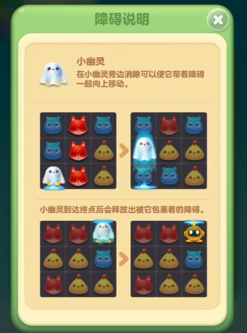 幽灵是一种挺特别也挺考验人的障碍物,它不像冰块或者雪块那样老老实实待在一个地方不动。你得先摸清楚它的脾气,它最喜欢在果冻块之间跳来跳去,你每操作一步,如果没打到它,它就可能嗖一下溜到别的位置去了。而且它还有两种不同的心情,普通状态下相对安稳些,但要是进入愤怒状态,那移动起来就更没规律了,会随机乱跳,让消除的难度大大增加。所以啊,进关卡后别急着动手,第一件事就是仔细看看初始布局,幽灵在哪儿,周围是什么环境,心里大概有个谱,预判一下它可能会往哪条路线上跑,这是成功对付它的基础。