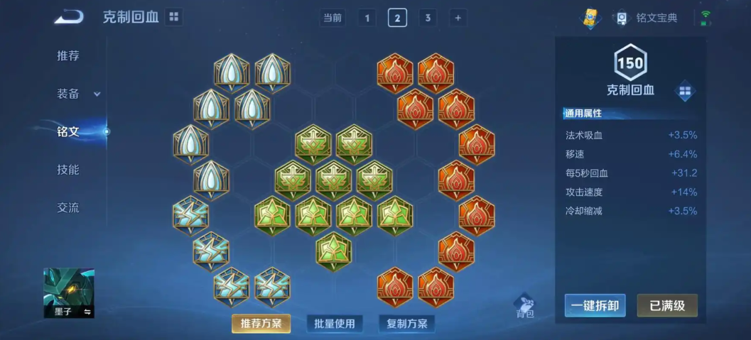 墨子的选择主要以强化法术攻击、技能冷却和机动性为主。一套标准且通用的铭文配置是10个梦魇、10个怜悯和10个狩猎,这套铭文能提供42点法术攻击、10%的冷却缩减和10%的移速加成。梦魇附带的法术穿透能有效提升墨子前期的清线与消耗能力,怜悯的冷却缩减让技能释放更加频繁,狩猎的移速则优化了墨子的走位与支援效率。如果玩家更注重续航能力,可以在蓝色铭文中部分或全部替换为贪婪或轮回,以获得法术吸血效果;若作为辅助位使用,则可以考虑搭配10宿命、10虚空、10调和这类偏向坦度与生存的铭文组合。