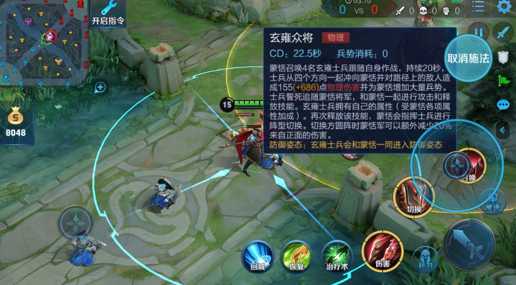 召唤师技能通常选择闪现或弱化,闪现可用于调整一技能突进方向或蓄力普攻的位置实现关键控制,弱化则能极大提升短时间内的承伤上限。对线期主升二技能以快速清线,二级和四级是蒙恬的强势期,可利用防御姿态下的蓄力普攻进行消耗与换血。团战前应提前在安全位置开启大招,并切换为提供额外正面减伤的方圆阵型。进入战场后,立即使用二技能进入防御姿态,利用蓄力期间的霸体效果免疫控制,并始终注意用一技能调整盾牌方向,确保正面对准主要威胁来源。纯肉蒙恬的连招相对简单,核心在于通过32A(开启大招、切换防御姿态、蓄力普攻)起手,随后根据战场情况用一技能微调方向并持续进行蓄力攻击。他的任务并非秒杀后排,而是通过巨大的身躯和范围伤害分割战场、限制敌方走位,并保护己方核心输出。