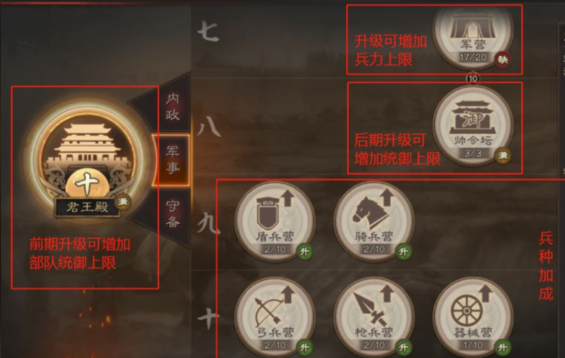 城建系统中的军营升级是驻守兵力提升的核心,每升一级军营都能按百分比增加所有武将的带兵容量,建议主城7本后优先把军营升到10级以上。分城也要同步建造兵营来扩大兵力储备,但要注意分城的兵只能补充分城部队。资源方面记得保证木材和铁矿供应,这些是征兵的基础资源,预备兵数量也要通过持续征兵来维持,建议睡前挂上8小时征兵队列。
