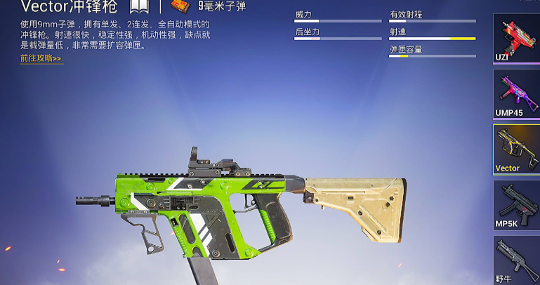 冲锋枪在近战和决赛圈中表现突出,它们的射速快,后坐力低,适合快速突袭和室内战斗。UZI和Vector以极高的射速和近战爆发力著称,能够在短时间内输出大量伤害,但通常不能装备高倍镜,限制了中远距离的发挥。UZI的稳定性在正面交火中能占据优势,而UMP45则因为弹容量多且易于控制,成为许多新手玩家的首选。相比之下,手枪在游戏中除落地初期外使用率较低,一般不作为主力武器。