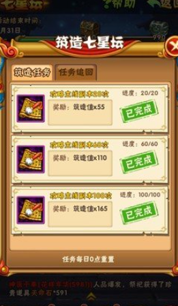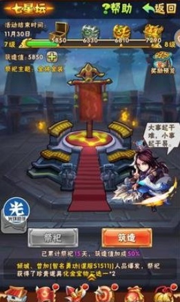 七星坛通过周期性轮换关卡配置保持新鲜感,定期调整敌人组合、战场环境和特殊规则,迫使玩家不断开发新战术,解决了游戏后期内容消耗过快的问题,这种动态内容更替让玩法始终充满策略探索活力。初期若无法通关全部关卡,可优先完成已解锁部分获取基础奖励,待战力提升后再尝试高阶内容,周常任务和排名奖励提供额外资源,注意活动周期及时参与,确保最大化收益。