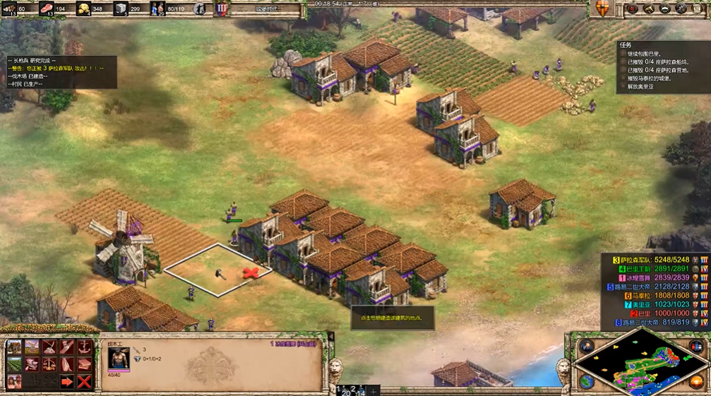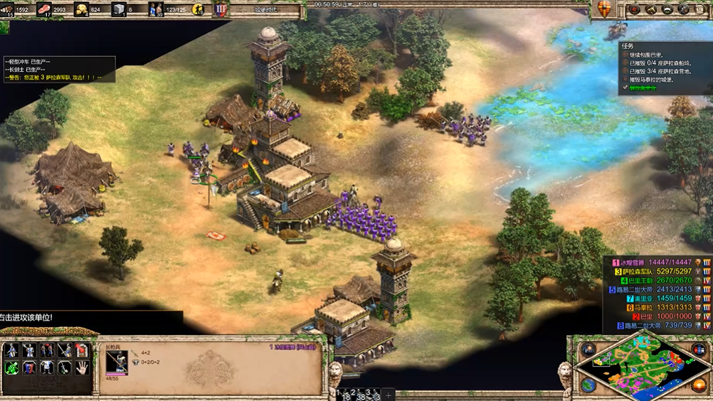 当你成功升级到城堡时代后,游戏就进入了中期推进阶段。此时的核心任务是按逆时针方向清理地图上的四个黄色萨拉森营地。在进攻第二个营地时,一个关键的策略是在你的蓝色盟友攻城队附近建造一座城堡,这样可以有效防止第三和第四个营地的萨拉森部队过来捣乱,保护盟友和你的侧翼安全。接下来需要解放两座城市,对于马泰拉,你可以在其上方建造一座城堡,这个行为会引出城内守军的强力弩炮,之后用甲胄骑兵配合冲车等攻城武器就能轻松拆掉城市建筑。同样的战术也适用于解放奥里亚,将守军引诱到你建造的城堡射程内消灭即可,在这个过程中要注意资源的调配,确保有足够的石头来建造这些关键的防御工事。