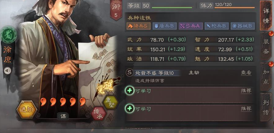 徐庶的定位为谋略型武将,擅长火攻和计策,其自带战法出兹不惑可对敌方施加灼烧、中毒或溃逃等负面状态,并造成持续伤害。由于技能效果依赖概率判定,实战中表现较为随机,但若能成功触发多重状态,输出能力不容小觑。