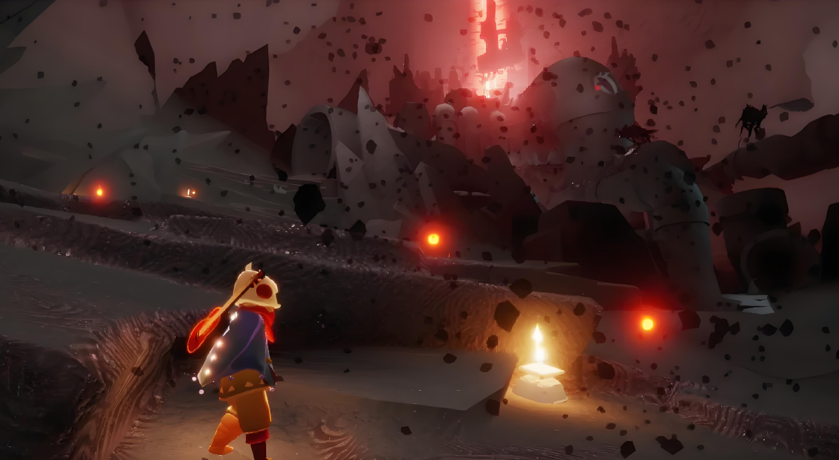 最后到达伊甸之眼就要开始献祭环节了,这里会失去所有光之翼,但别担心这是必经过程。沿着小路一直往前走,把光之翼献给石像旁的小黑人,献祭越多最后获得的红蜡烛也越多。完成献祭后会进入重生剧情,跟着飞鸟进入银河就能完成整个暴风眼关卡。