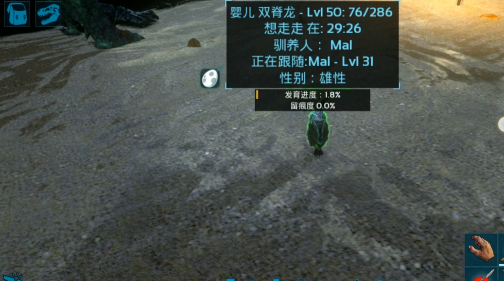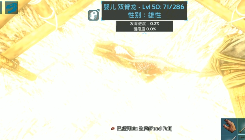 破壳后的小双脊龙需要立刻认领,并持续喂养。肉食恐龙要往背包放生肉,素食则放果子,按T键能快速转移食物。幼龙阶段喂养不能停,否则会饿死。记得关闭巡逻模式,防止它乱跑。如果有空调最好,5台以上能大幅降低温度调节难度,但篝火方案对新手更友好。