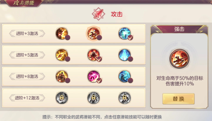 前排站位推荐怒焰潜能,通过普攻快速积攒怒气;后排则选择凯歌潜能,依靠击杀回复实现怒气循环。刺袭潜能进一步强化了对敌方后排的压制力,无论是怒气技能还是被动追击,都能有效针对脆皮单位。这种加点思路尤其适合快攻阵容,能在短时间内瓦解敌方阵型。