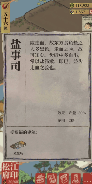 食盐在盐商系统中扮演重要角色,盐商使用盐引作为交易货币,而盐引需要通过消耗食盐来兑换。玩家与盐商互动时,可以委托运输资源、人力或采购建筑,盐引的需求量受库存食盐量影响。当食盐库存较低时,盐引价值较高,交易效率提升;反之,库存过多会导致盐引贬值。