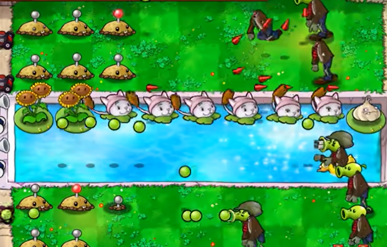中期阶段应巩固防线并优化资源产出,在阳光收入稳定后,可以在水路安全地补种一行向日葵,并搭配大蒜,这样既能增加阳光生产,大蒜的气味也能有效分散和吸引僵尸火力,保护核心输出植物。由于植物僵尸关卡中,僵尸不会从水池中突然冒出来,因此水路区域的布局可以更大胆一些,主要用于发展经济和辅助控场。这个阶段要稳扎稳打,避免为了快速推进而冒进,导致防线出现漏洞。