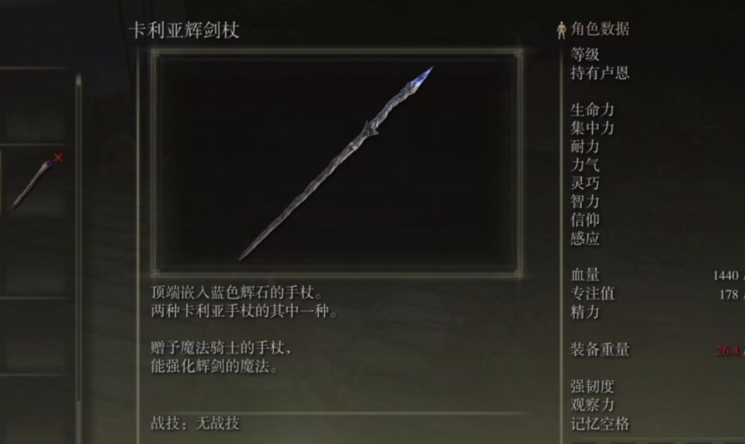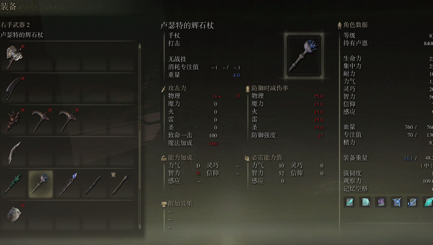 中期咱们可以考虑更换卢瑟特的辉石杖,这把杖能大幅提升魔法伤害但会额外消耗50%蓝量,适合追求爆发的战斗场景。获取地点在魔法学院雷亚卢卡利亚,需要击败隐藏BOSS满月女王后解锁区域。如果喜欢近战法师流派,名刀月隐是不二之选,这把太刀战技能释放剑气且智力补正优秀,获取方式是在盖尔坑道最底层击败熔岩土龙BOSS掉落。